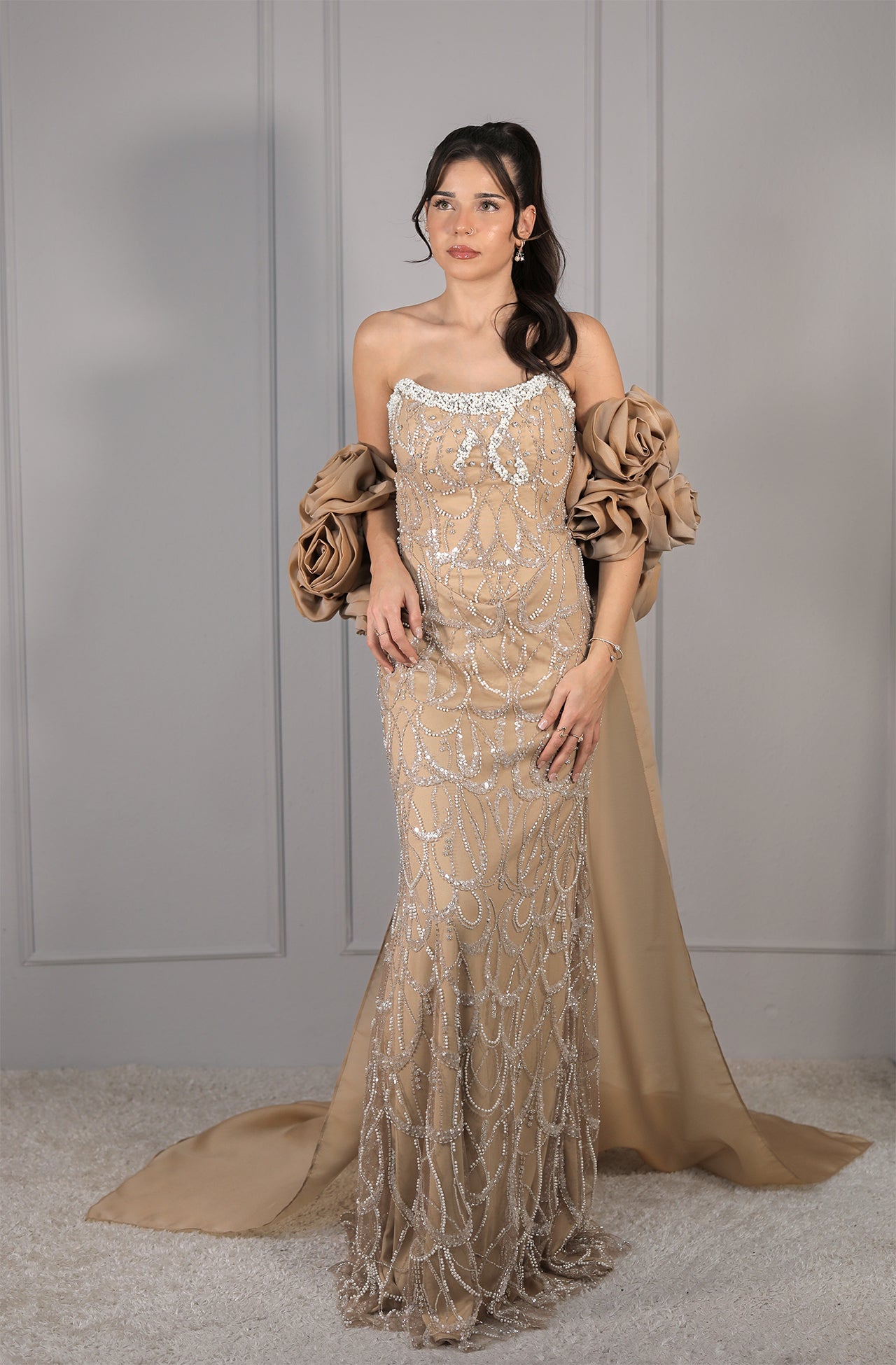 🤎 Eleganz in Braun – Besticktes Abendkleid mit Blumendetail