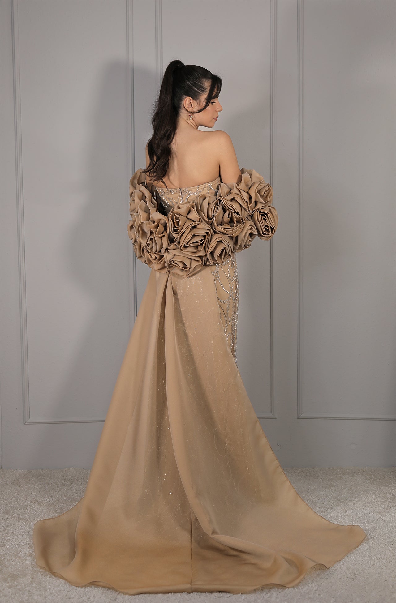 Die spektakulären 3D-Blumendetails an den Ärmeln verleihen dem Kleid einen einzigartigen Haute-Couture-Charakter – kunstvoll, feminin und unverwechselbar.