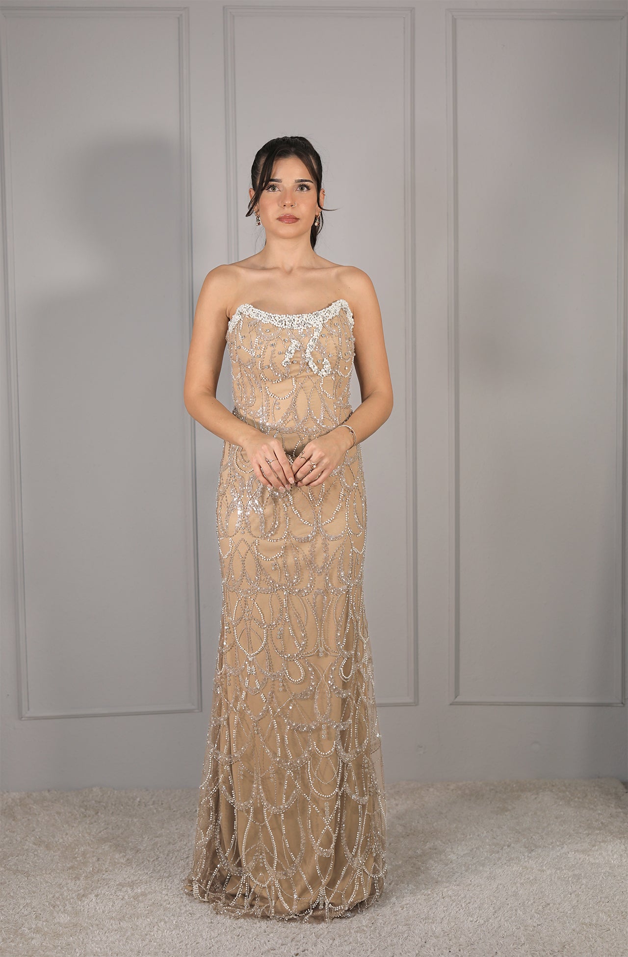 Dieses Abendkleid in edlem Braun vereint warmen, luxuriösen Glanz mit einer modernen, couture-inspirierten Silhouette.