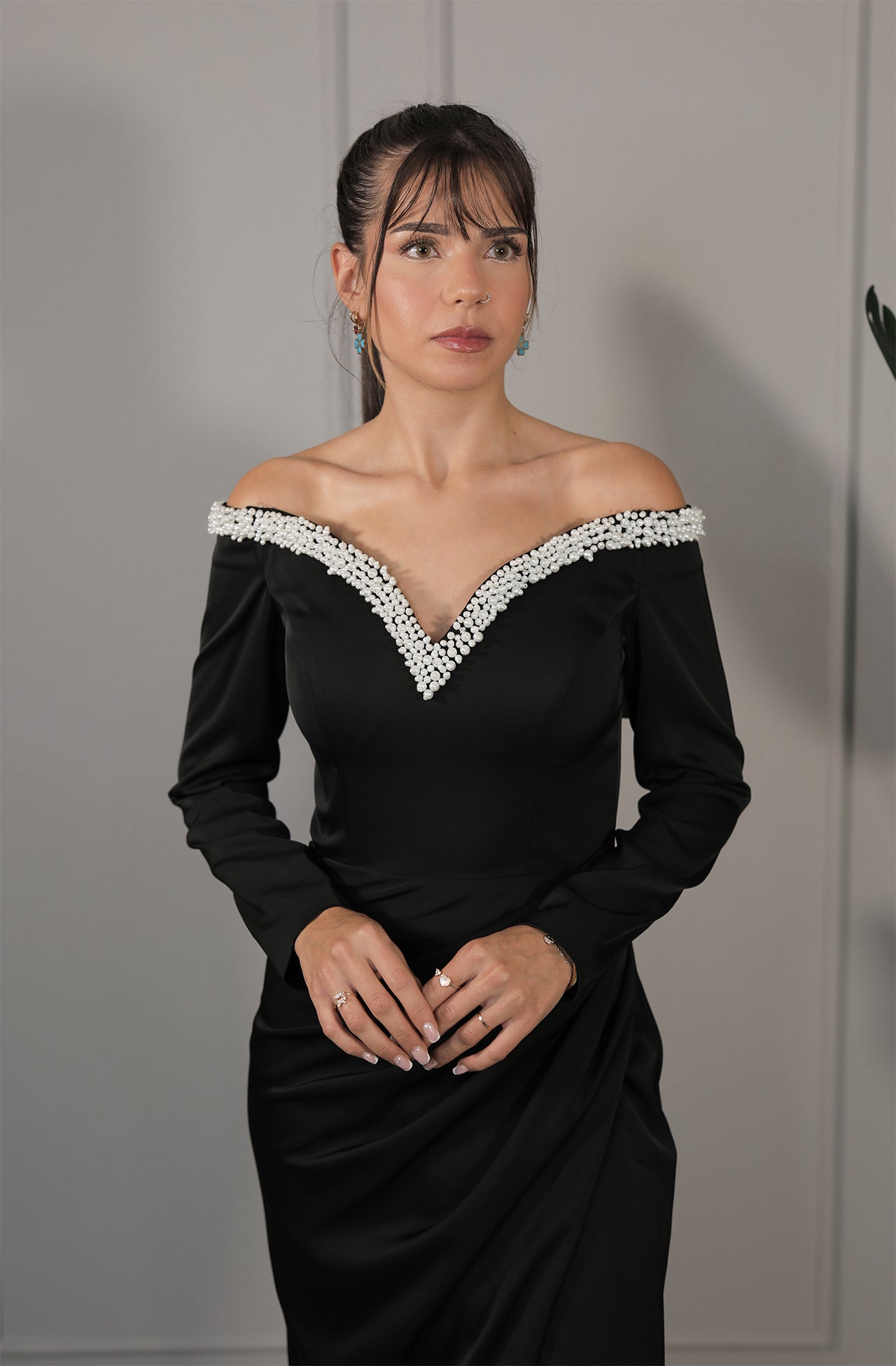 Off‑Shoulder‑Ausschnitt mit Perlenbesatz: Der tiefgezogene V‑Ausschnitt ist mit weißen Perlen verziert. Er betont die Schultern und das Dekolleté und bringt einen eleganten, modernen Touch.